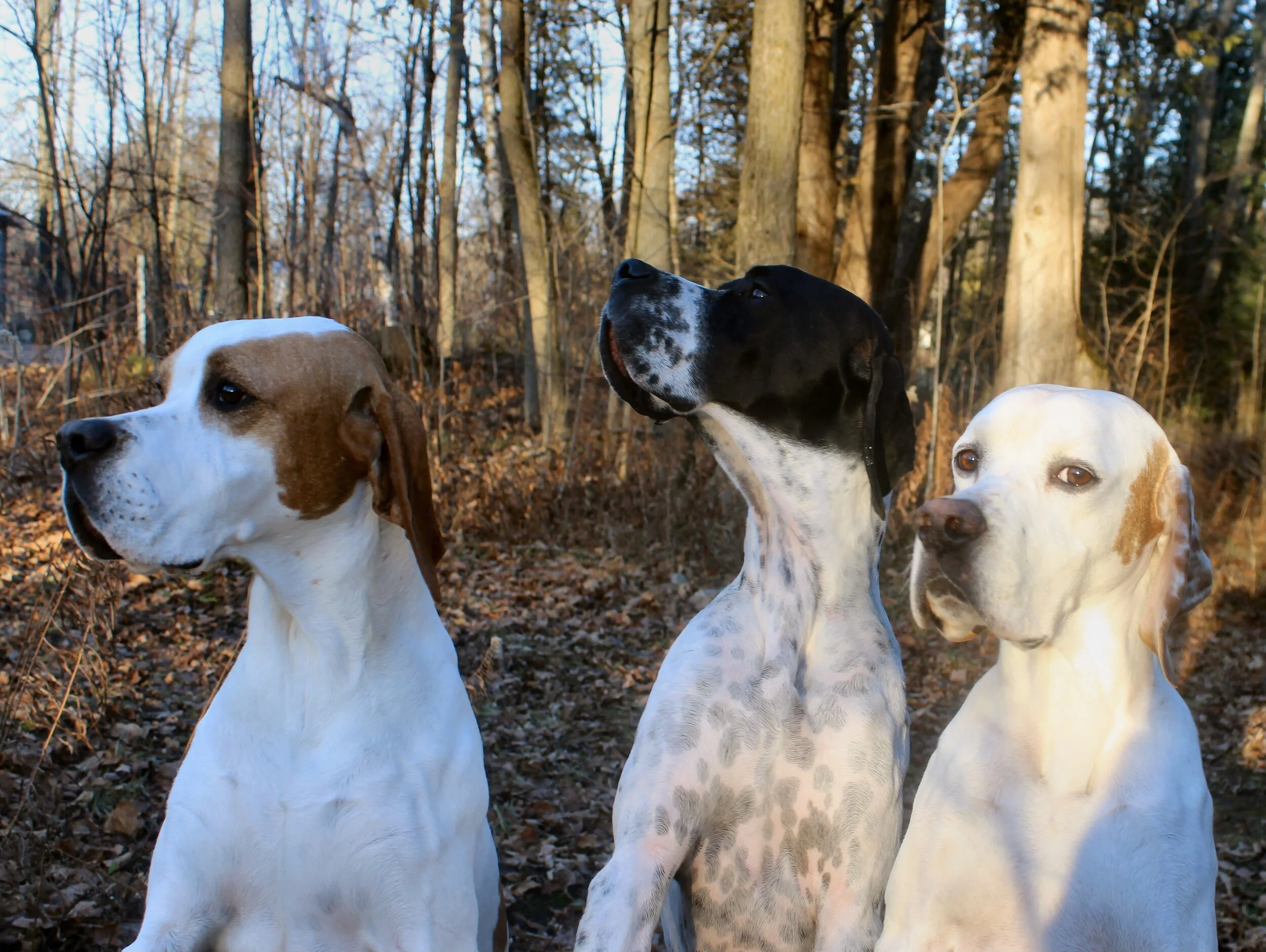English Pointers, or simply “Pointers”, are gun dogs named for the characteristic pose they assume when they catch the scent of game. They stand motionless with their head lowered and nose pointed toward the game; the tail held horizontally, in line with the head and back. One leg is raised and bent at the wrist. The direction the dog points guides the hunter to the game.